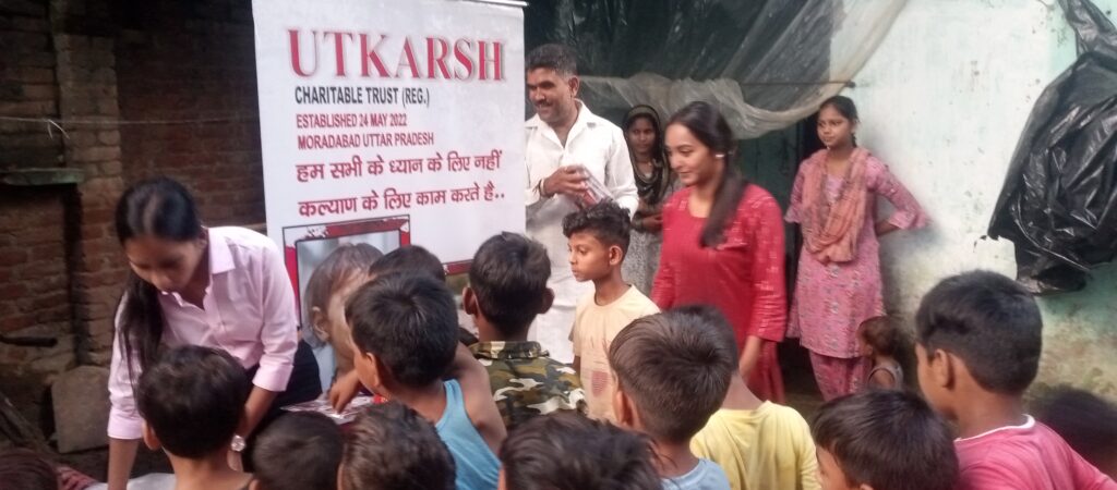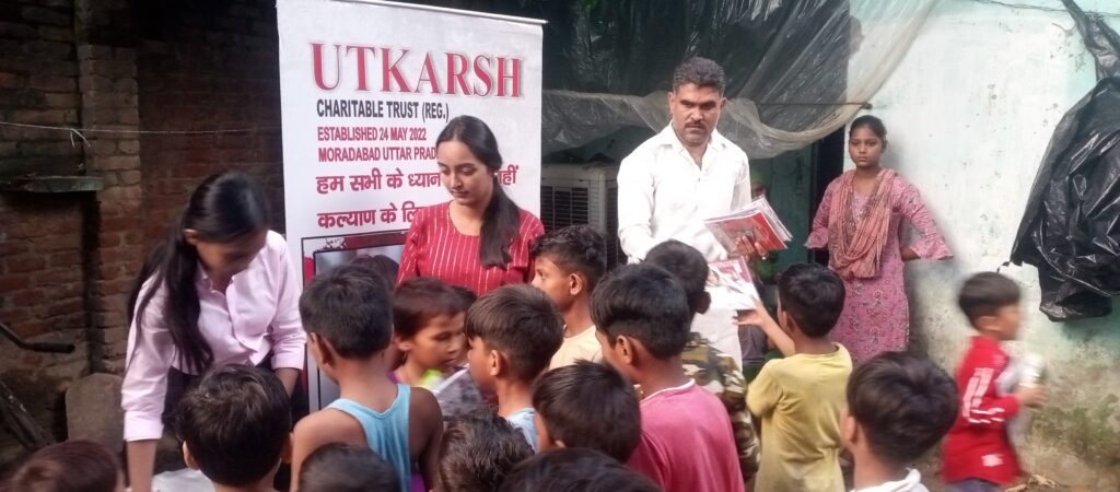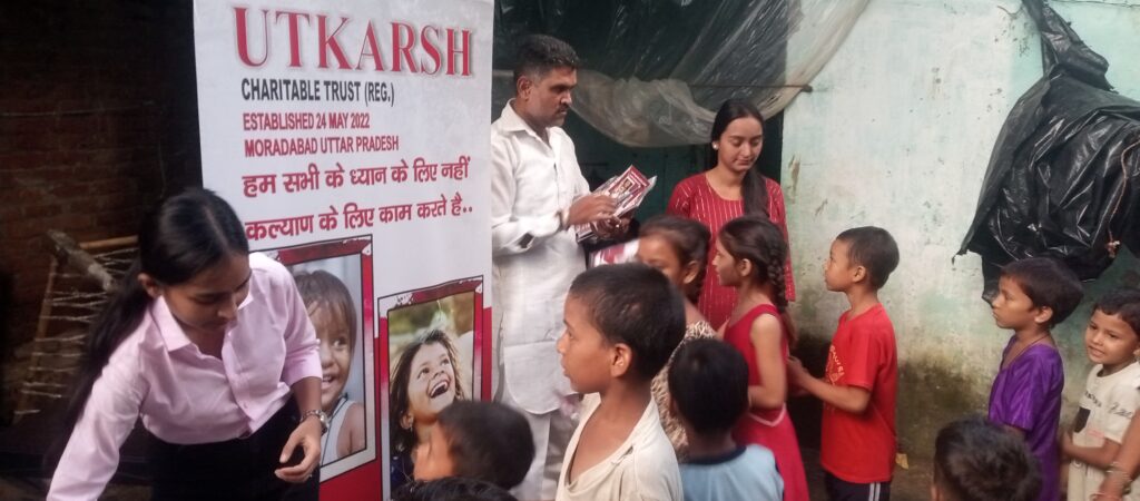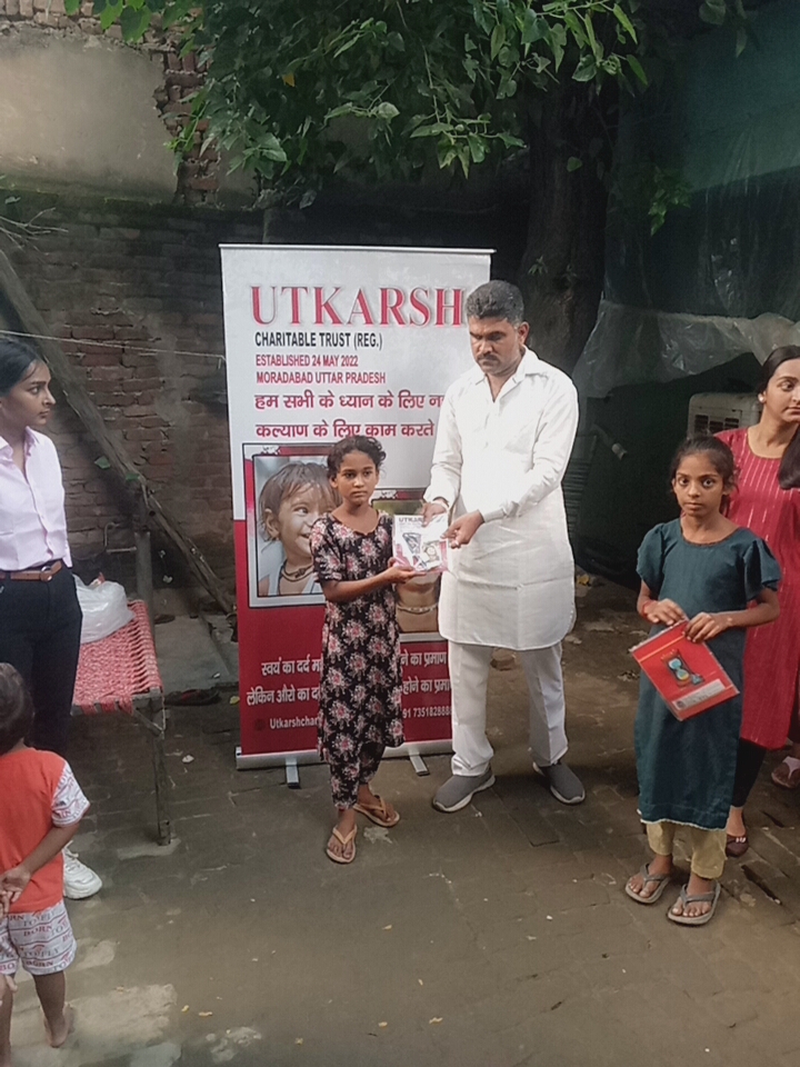भिक्षा से शिक्षा तक के उद्देश्य को पूरा करने के लिए सड़क पर जीवन व्यतीत करने वाले बच्चों के लिए उत्कर्ष चैरिटेबल ट्रस्ट (रजि0) द्वारा ट्रस्ट की अध्यक्ष नेहा कश्यप कोषाध्यक्ष पलक कश्यप ने बच्चों को कापी किताबें पेंसिल रबड़ कटर एवं खाद्य सामग्री का वितरण किया ।